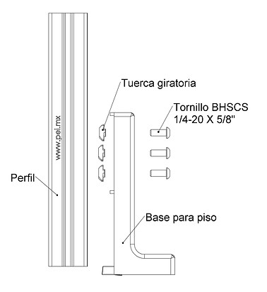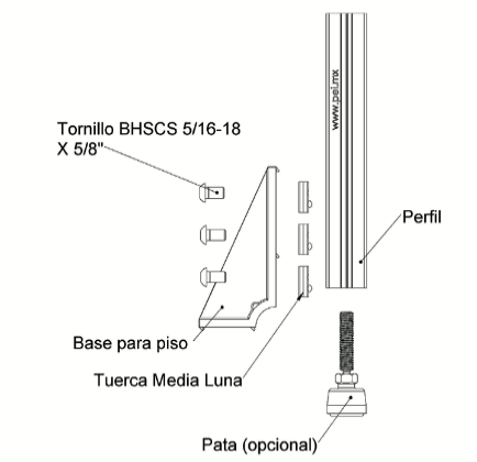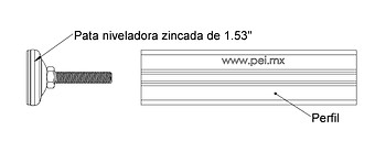 La pata niveladora se instala únicamente en perfiles de 1.5” x 3” y 3”x 3” utilizando una base para pata niveladora en el extremo del perfil.