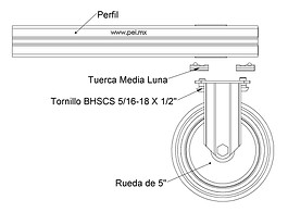 Una vez colocada la base en el perfil se utiliza un tornillo 3/4-16x1” y una arandela de 3/8”, colocándolos desde la parte inferior interna de la rueda, por el ojillo de la misma.