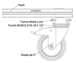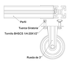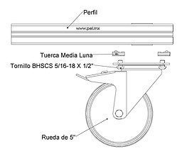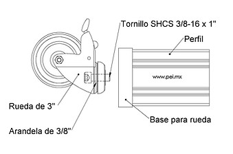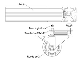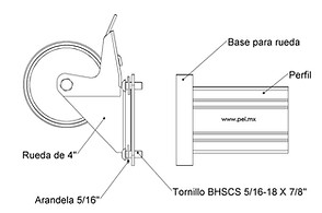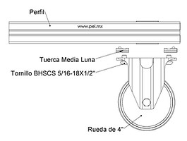 Una vez colocada la base en el perfil, se utilizan 4 tornillos 1/4-20 X 1/2”, colocándolos desde la parte inferior dela rueda, por los orificios roscados de las esquinas.