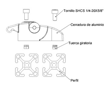 Funciona con cuatro tornillos SHCS 5/16-18 X 5/8”que pasan por los agujeros de la bisagra para posteriormente unirse a las tuercas previamente colocadas en las ranuras laterales de ambos perfiles.